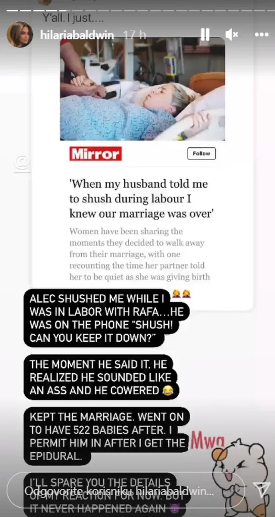 Hilaria je svojim pratiteljima rekla da će ih za sada poštedjeti “detalja njezine reakcije”, ali je spomenula da joj Alec “nikad” više nije rekao da zašuti u rodilištu.