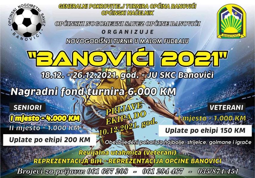 Nogometni savez Općine Banovići organizuje novogodišnji turnir u malom fudbalu “Banovići 2021” koji će biti održan od 18. do 26. decembra u JU SKC Banovići.