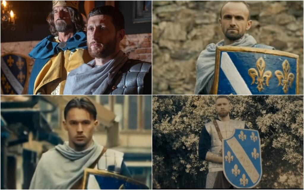 Dedić je u spotu obučen kao vitez u Sarajevu ispred Sebilja sa štitom na kojem su ljiljani.