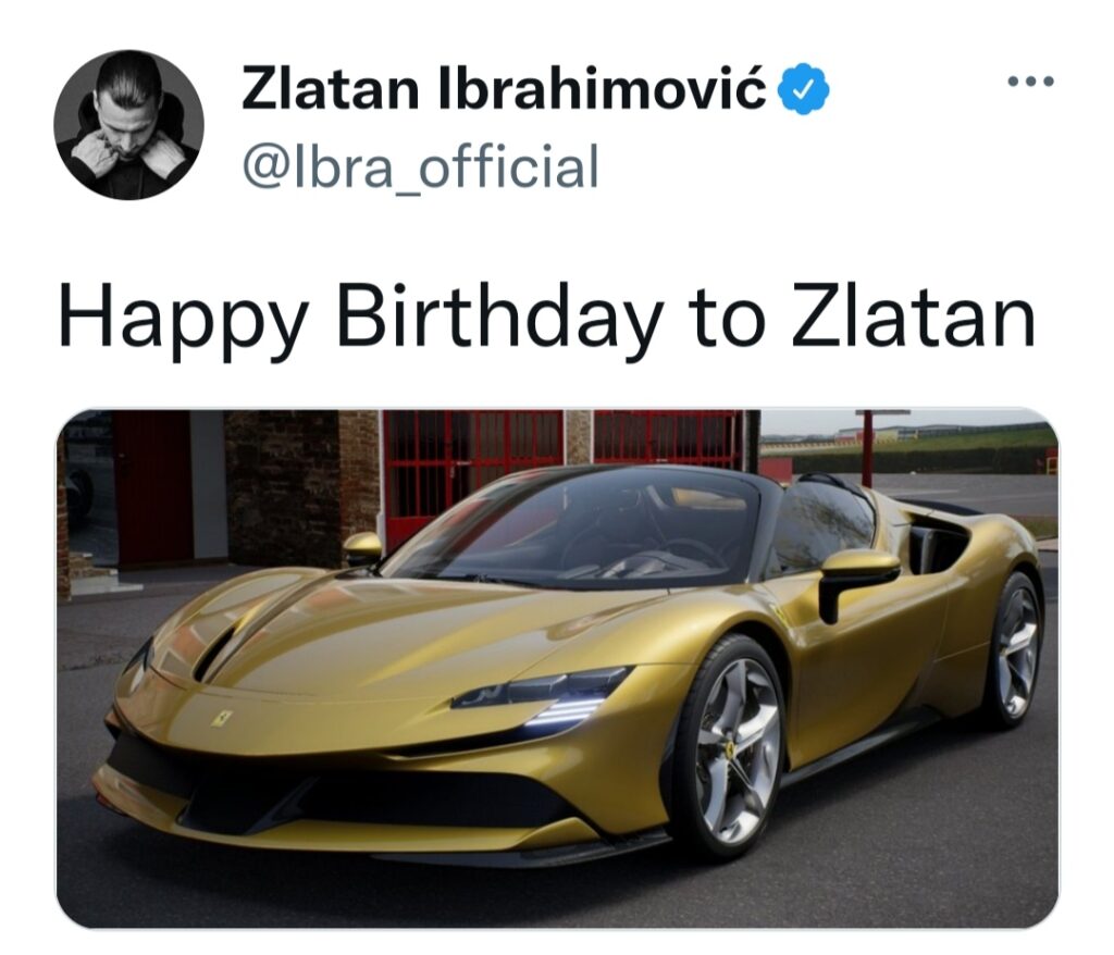 Ibrahimović je objavio fotografiju Ferrarija uz poruku kojom sebi čestita rođendan.