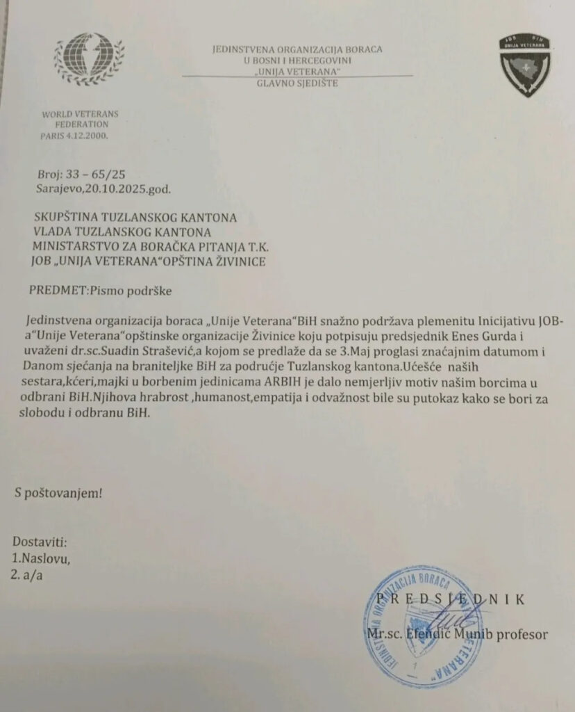 Jedinstvena organizacija boraca „Unija veterana„ BiH snažno podržava plemenitu Inicijativu JOB-a „Unija veterana“ opštinske organizacije Živinice koju potpisuju predsjednik Enes Gurda i uvaženi dr. sc. Suadin Strašević, a kojom se predlaže da se 3. maj proglasi značajnim datumom i Danom sjećanja na braniteljke BiH za područje Tuzlanskoh kantona.