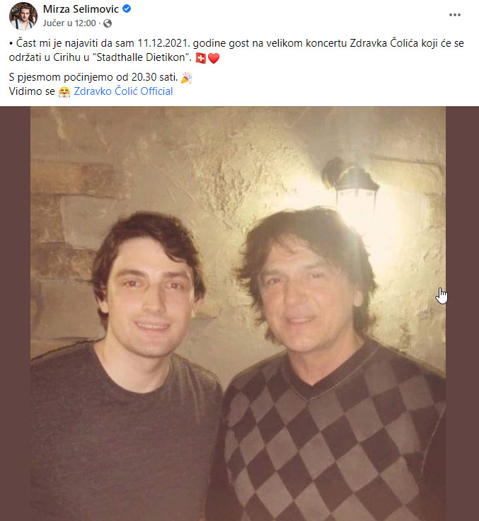 Gost na velikom koncertu Zdravka Čolića u Cirihu biće Mirza Selimović, pobjednik osme sezone “Zvezda Granda”. Koncert je planiran ua 11. devembar.
