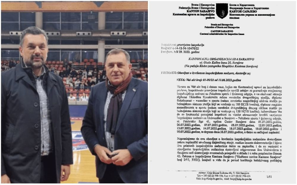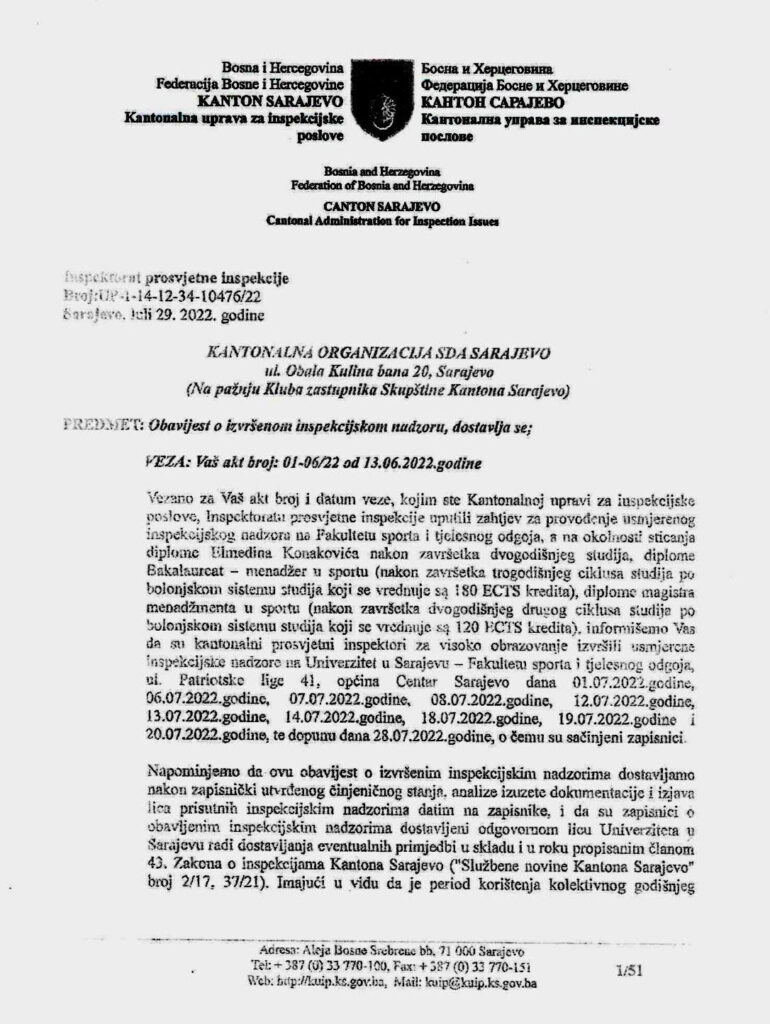 Vezano za Vaš akt broj i datum veze kojim ste Kantonalnoj upravi za inspekcijske poslove, Inspektorata prosvjetne inspekcije uputili zahtjev za provođenje usmjerenog inspekcijskog nadzora na Fakultetu sporta i tjelesnog odgoja, a na okolnosti sticanja diplome Elmedina Konakovića nakon završetka dvogodišnjeg studija, diplome Bakalaureat – menadžer u sportu (nakon završetka trogodišnjeg ciklusa studija po bolonjskom sistemu studija koji se vrednuje sa 180 ECTS kredita), diplome magistra menadžmenta u sportu (nakon završetka dvogodišnjeg drugog ciklusa studija po bolonjskom sistemu studija koji se vrednuje sa 120 ECTS kredita), informišemo Vas da su kantonalni prosvjetni inspektori za visoko obrazovanje izvršili usmjerene inspekcijske nadzore na Univerzitetu u Sarajevu – Fakultetu sporta i tjelesnog odgoja, ul. Patriotske lige 41, Općina Centar Sarajevo, dana 1. 7. 2022. godine, 6. 7. 2022. godine, 7. 7. 2022. godine, 8. 7. 2022. godine, 12. 7. 2022. godine, 13. 7. 2022. godine, 14. 7. 2022. godine, 18. 7. 2022. godine, 19. 7. 2022. godine i 20. 7. 2022. godine, te dopunu dana 28. 7. 2022. godine, o čemu su začinjeni zapisnici.