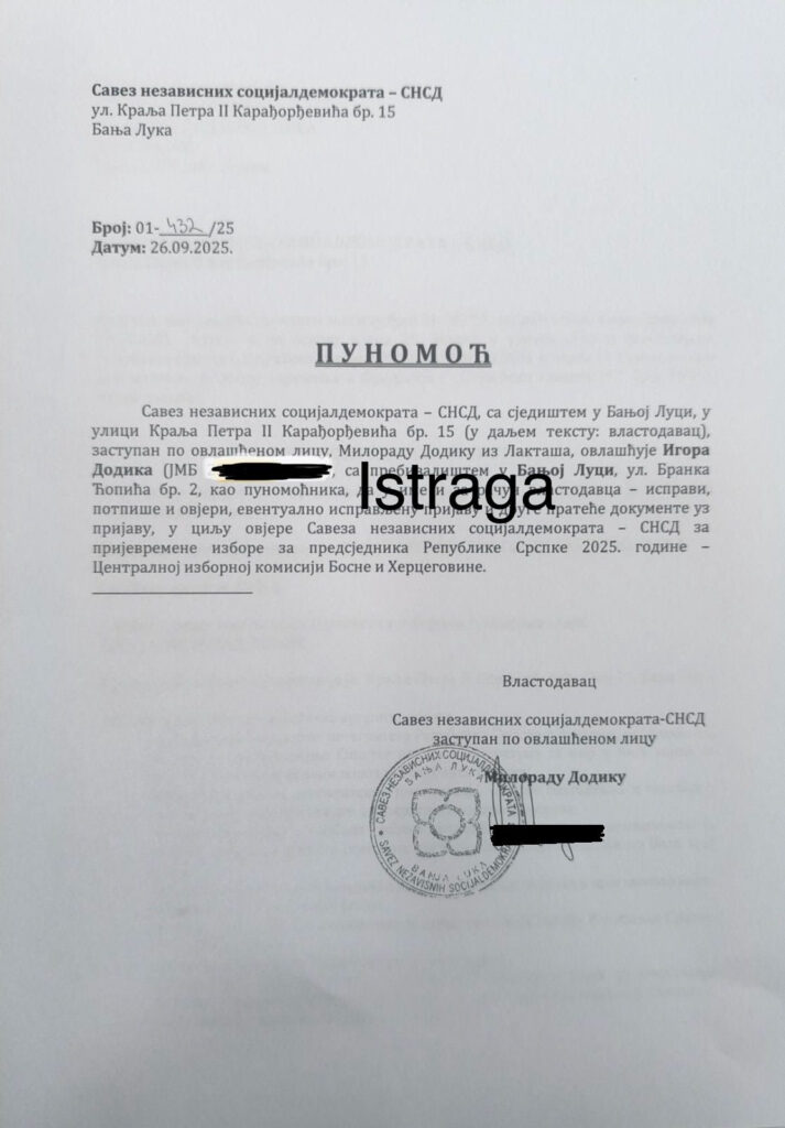 – Savez nezavisnih socijaldemokrata SNSD, sa sjedištem u Banjoj Luci, ovlašćuje Igora Dodika da u ime i za račun vlastodavca – ispravi, potpiše i ovjeri, eventualno ispravljenu prijavu i druge prateće dokumente uz prijavu, u cilju ovjere SNSD-a za prijevremene izbore za predsjednika Republike Srpske 2025. godine – Centralnoj izbornoj komisiji BiH – navedeno je u punomoći koju je potpisao Milorad Dodik.