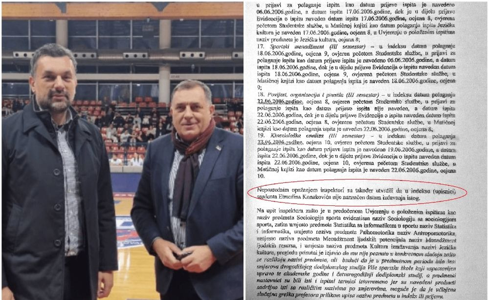 Neposrednim uvidom u dokumentaciju koja se nalazi u dosjeu 839 studenta Elmedina Konakovića, inspektori su utvrdili da je imenovani diplomirao na dvogodišnjem studiju dana 24. 6. 2006. godine (diploma broj 405/06 od 1. 7. 2006. godine) i stekao višu spremu i zvanje viši sportski menadžer. Nadalje je izvršen uvid u Knjigu diplomiranih studenata Viših sportskih trenera i utvrđeno da je pod rednim brojem 405, broj dosjea 839, upisan Elmedin Konaković, koji je diplomirao na smjeru viši sportski menadžer, ocjenom 10, sa brojem 02-2791/1 od 24. 6. 2006. godine, sastav Komisije: dr. A. Kozarčanin, dr. N. Nurković, dr. S Kapo i dr. Husnija Kajmović.