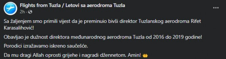 – Sa žaljenjem smo primili vijest da je preminuo bivši direktor Tuzlanskog aerodroma Rifet Karasalihović! Obavljao je dužnost direktora međunarodnog aerodroma Tuzla od 2016 do 2019 godine! Porodici izražavamo iskreno saučešće. Da mu dragi Allah oprosti grijehe i nagradi džennetom. Amin – piše na Facebook stranici Flights from Tuzla / Letovi sa aerodroma Tuzla.