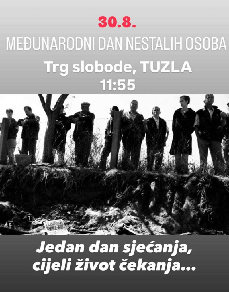 Institut za nestale osobe Bosne i Hercegovine i njegov Savjetodavni odbor, u saradnji s Međunarodnim komitetom Crvenog križa (MKCK), 30. avgusta na Trgu slobode u Tuzli organizuju centralnu manifestaciju povodom Međunarodnog dana nestalih osoba.